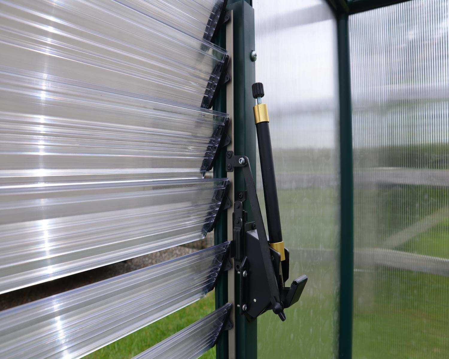 The Automatic Louver Side Window Opener is designed to automatically control the temperature and provide additional ventilation in Palram – Canopia Greenhouses equipped with a side louvre window. As the air inside the greenhouse warms, the vent gradually opens to allow the correct amount of air flow into the greenhouse and closes when the optimal temperature is reached. The vent arm was designed with the use of wax that expands with heat to push a piston, which opens the louvre window, as the air gets warmer, then contracts as it cools, closing with the use of a spring. The Automatic Louvre Opener operates without the use of electricity.