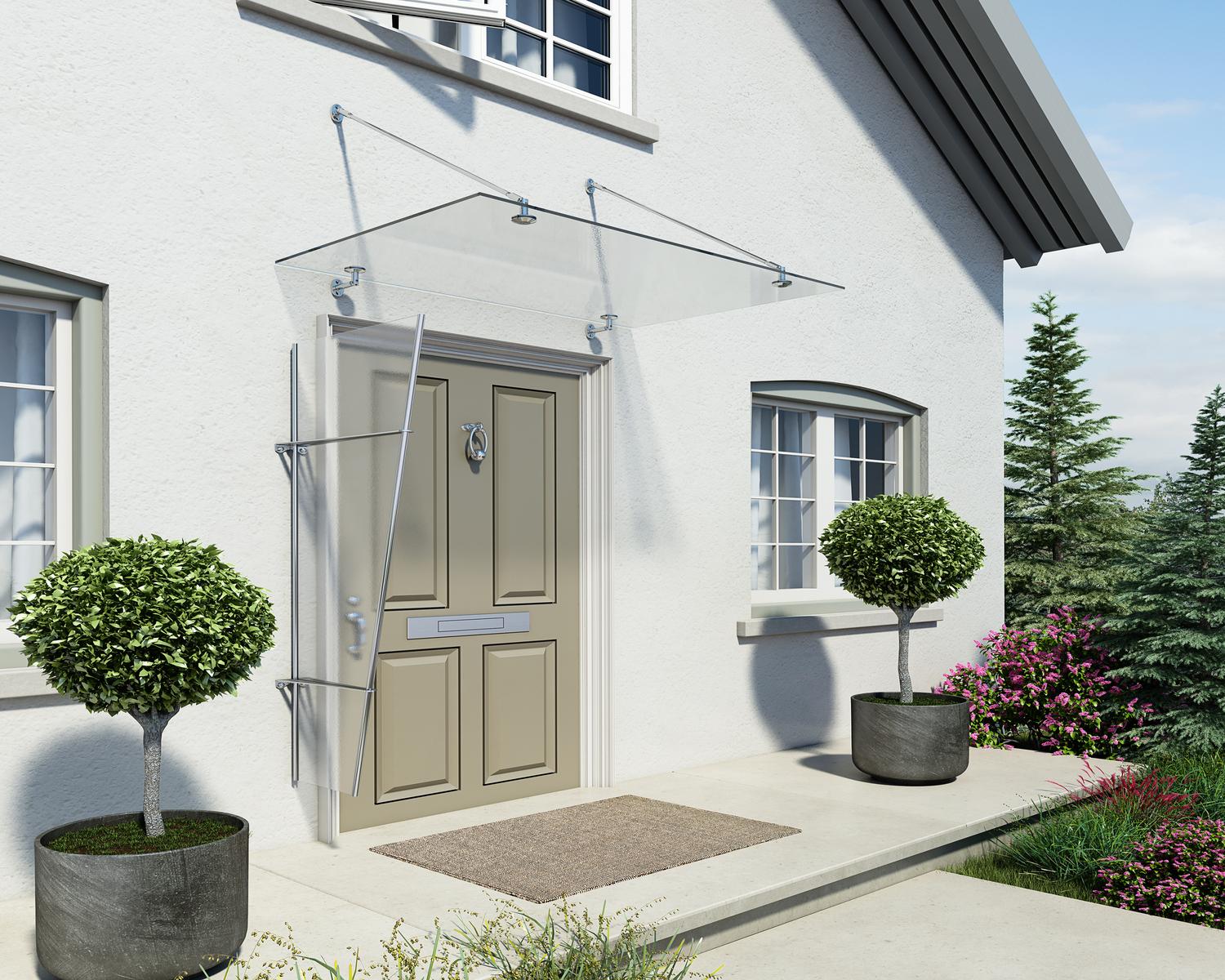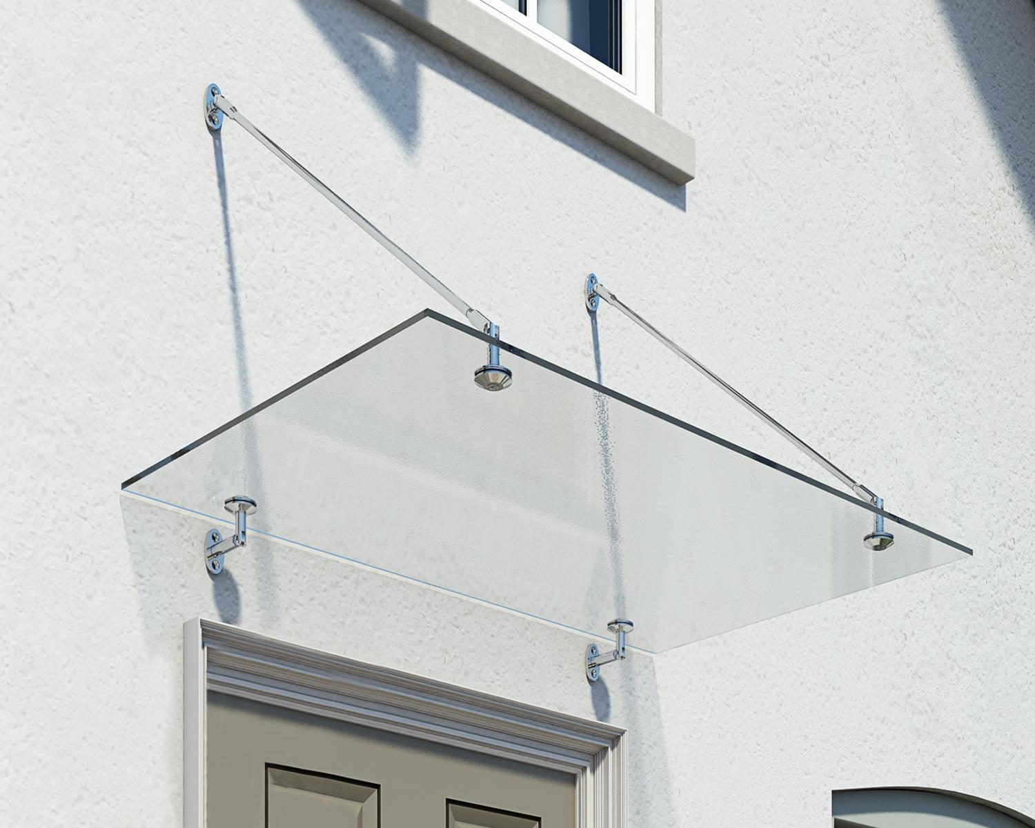 - Stylish tempered glass awning, designed to decorate and protect your entryway, doors, and windows.
