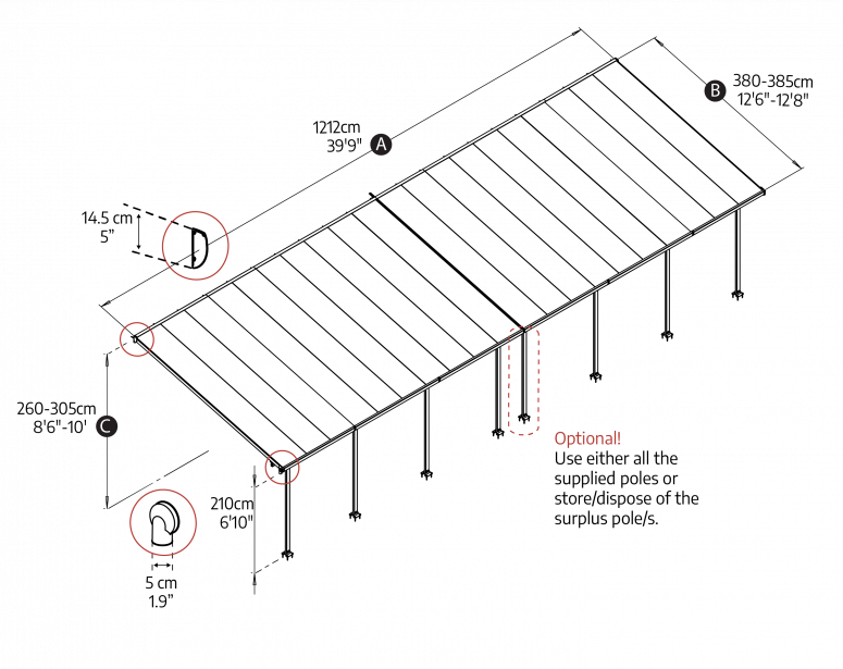 Enjoy warm days, cool nights, and everything in between under the extra-wide Feria Patio Cover. The Feria Patio Cover Kit is an attractive, maintenance-free roofing solution for various outdoor uses such as a patio cover, sun lounge, and carport. Protect your valuables from unpredictable weather and harmful UV rays with this high-performance structure. It features flexible positioning poles which enable you to set your required height at the wall connection, the distance from the house and between the poles at the front. It was designed to be simply assembled by 2 people, using the Click N’ Lock roofing system for safe and simple assembly, preventing leaks. It requires no experience, no special skills, and no special tools. The Feria Patio Awning provides your family with an elegant, beautifully crafted, sturdy addition to your outside living space that is sturdy and rust-free for many years to come.